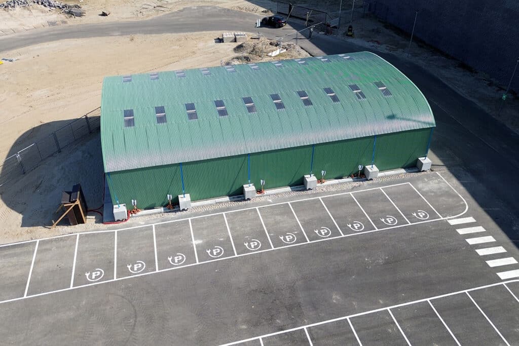 Na het vaststellen van het materieel en de vermogensbehoefte ontwierp Bouwtech BPI de complete bouwplaatsinrichting. “Het laadplein werd daarbij opgesplitst in twee locaties, elk met een eigen trafostation. Door de laadstations stekkerbaar te maken, kunnen ze eenvoudig worden verplaatst naar de plek waar op dat moment e-materieel actief is. Dit bleek een belangrijk pluspunt in de gunningsfase”, weet Hartman. De totale infrastructuur omvat onder meer 1.200 meter 23 kV-middenspanningskabel, 800 meter laagspanning, 400 meter drukriool, een waterleiding van 1.200 meter en diverse laadstations van 11 tot 150 kW.